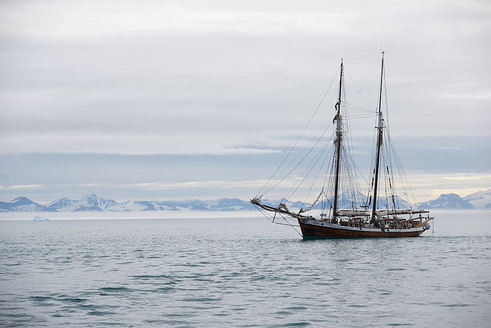 The sailing continues eastwards through the awesome Øfjord. This was one of the most spectacular parts of the trip. Terrific mountain peaks and granite walls tower 2000 meters up from the sea just like if the Cerro Torre (one of the majestic mountains of the Southern Patagonian Ice Field in South America) and Fitzroy river (in Queensland, Australia) have been moved to the Arctic: A true feast for the eyes. We stopped at a small glacier along. the way and some of us did a little hike in and around in before heading back to the Donna Wood and on to the next destination – Whiskey Rock. Here we stopped and had a quick drink and admired the views some more. The sky was a little overcast and grey but offered some nice diffused light for the images. There was a stiff breeze coming down the channel but we didnt mind as the views were worth it. After Whiskey Rock we sailed on towards Jyttes Havn Bjørneøe or another similar location to set anchor around 21:00 and retire for the night,